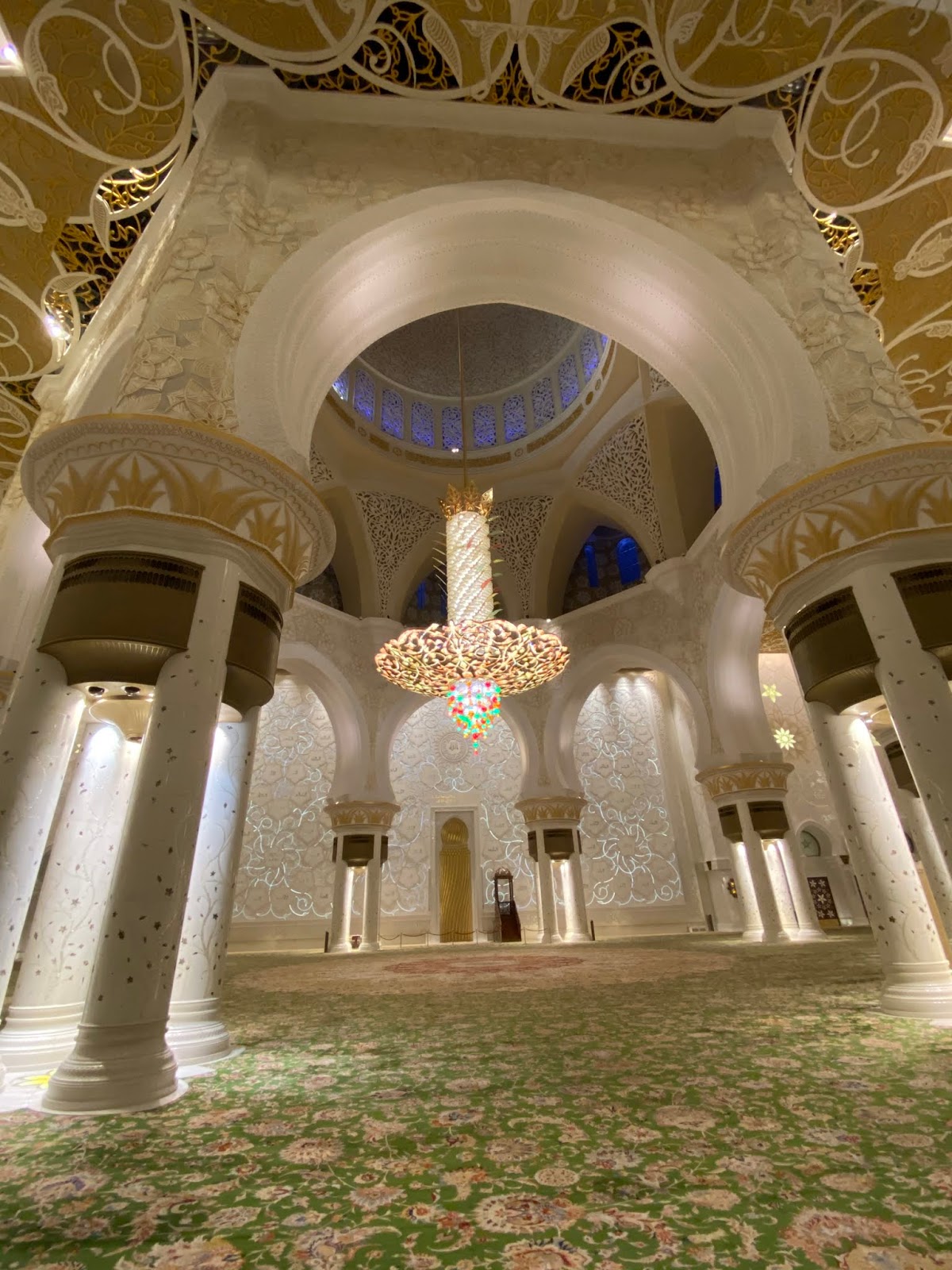 真的是太美了,我只能這麼說!純白色的清真寺建築在黃色及藍色燈光的映襯下顯得神聖、神秘,入門後更是別有洞天,大圓頂等著迎著你!繞著走一圈,到處是阿拉伯風格花紋設計,還有超大的燈飾,中東藝術在這裡獲得完美的體現。非常推薦大家前來領略阿拉伯建築藝術的巔峰呈現。